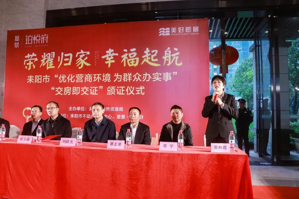 開發(fā)商代表黃海霞致辭,她簡述了該項目18年至今的發(fā)展歷程。房屋交付是考驗、責(zé)任、品質(zhì)的實景兌現(xiàn)。“交房即交證”儀式能在耒陽首次順利舉辦,既離不開耒陽市政府和相關(guān)部門的大力支持和積極推動,同時也歸功于房產(chǎn)從業(yè)者們的堅守與付出。作為房產(chǎn)從業(yè)者,今后將會一如既往的支持與堅持“我為群眾辦實事”的實踐精神,積極履行交房交證的主體責(zé)任,加快交房進(jìn)度,讓購房者放心收房、安心拿證。